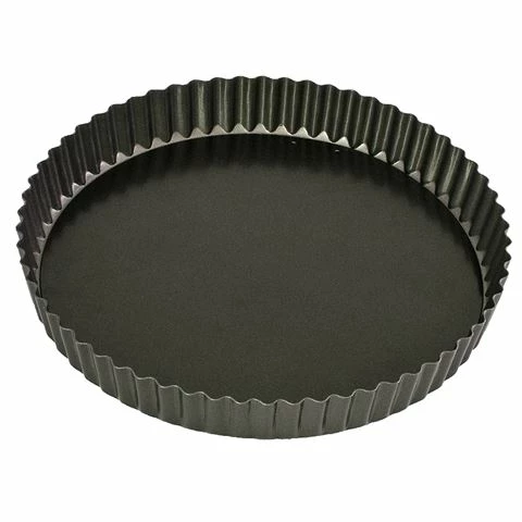 A premium fluted round tin ideal for making quiches, tarts and flans. Made from heavy duty carbon steel, it features a double non-stick coating and loose base for easy release.