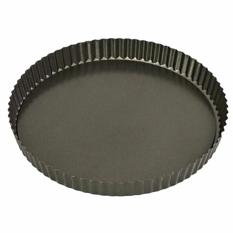 A premium fluted round tin ideal for making quiches, tarts and flans. Made from heavy duty carbon steel, it features a double non-stick coating and loose base for easy release.