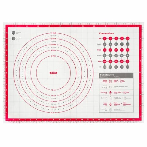This Silicone Pastry Mat protects countertops while providing essential information for your baking adventures. The non-slip, food-safe silicone stays in place, and is non-stick for effortless food release. From dough diameter outlines to unit conversions, and even helpful tips for ingredient substitutes and a border that acts as a ruler, there’s no need to get any screens or books dirty looking up the information you need while baking. The Mat even has guidelines to help you roll dough to the perfect size for pies and pizzas.